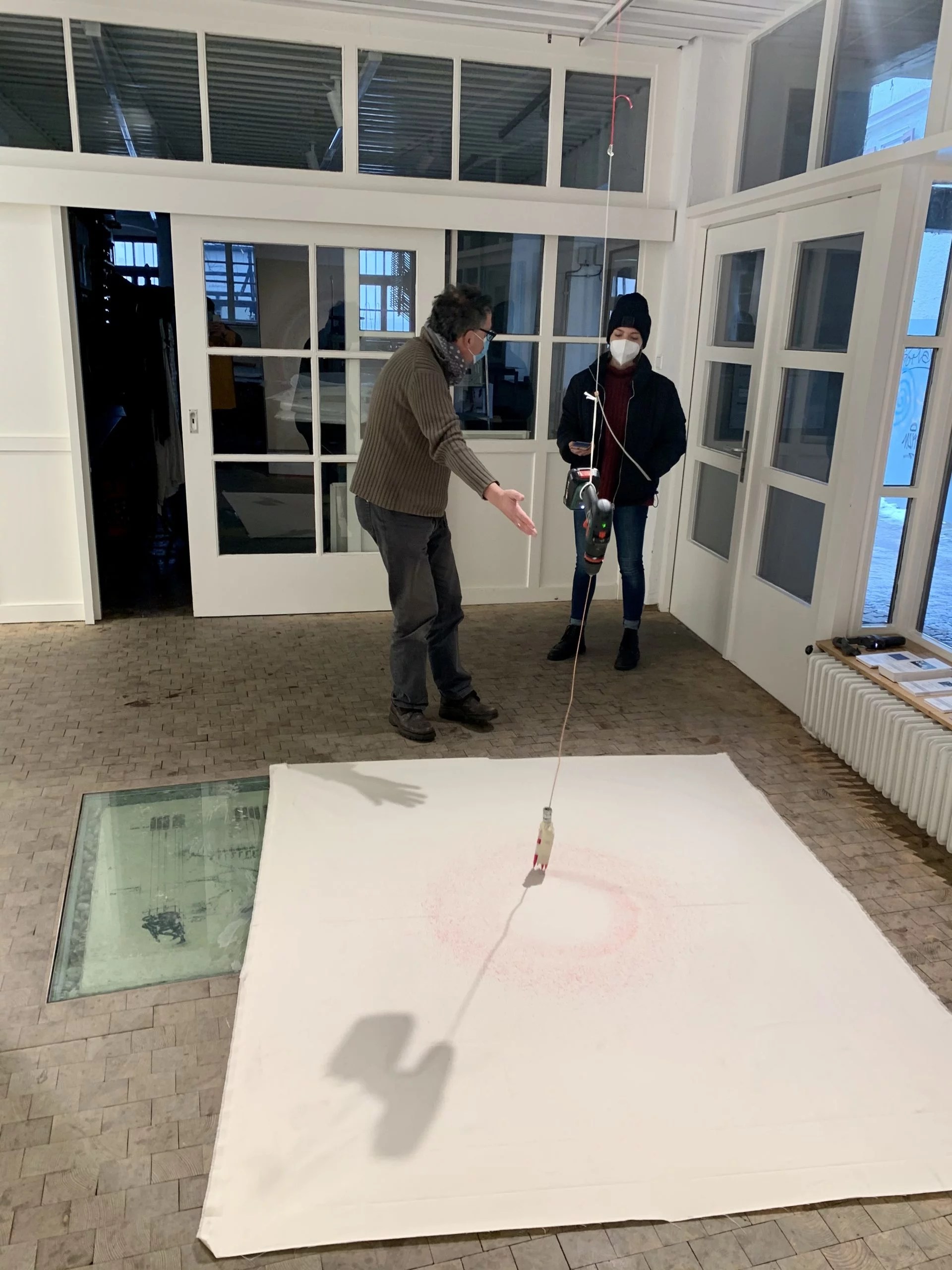 Kugelschreiber tanzen automatisch angetrieben über einer am Boden liegenden Leinwand. Gebündelt und an einem Draht befestigt, werden sie von den Umdrehungen eines Akkuschraubers bewegt. Dieser hängt, befestigt an einem Seil, an einer Holzkonstruktion. Zwischen Bohrer und Zeicheninstrument dient der stabile Draht als Verbindungsglied. Fast meditativ versunken stehen wir als Betrachter*innen der Konstruktion gegenüber, beobachten gebannt den Tanz der Kugelschreiber. Was wird passieren? Welche Spuren werden die Stifte-Bündel wohl auf den nächsten paar Zentimetern hinterlassen? Die Kugelschreiber ziehen ihre Kreise, bewegen sich gleich und doch nicht identisch. Je nach Länge der Schnur, an dem der Akkuschrauber angebracht ist, und je nach eingestellter Geschwindigkeit des Geräts, entstehen unterschiedlich dicht beieinanderliegende Striche auf dem Malgrund. Nach und nach formen sie sich zu deutlichen Spuren, zu Kreisen, deren Durchmesser immer größer werden.